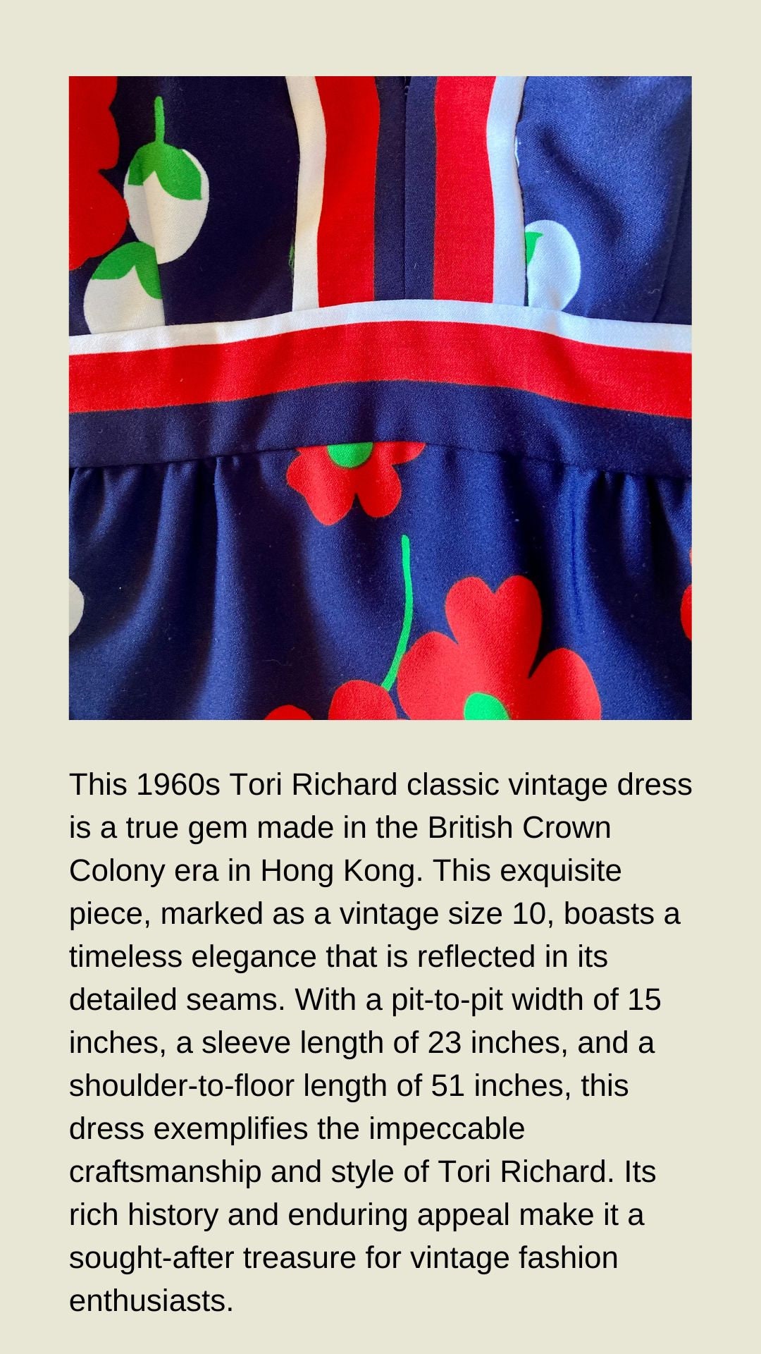 Vintage Tori Richard designer Hawaiian label .This 1960s Tori Richard classic vintage dress is a true gem, made in the British Crown Colony era in Hong Kong. This exquisite piece, marked as a vintage size 10, boasts a timeless elegance that is reflected in its detailed seams. With a pit-to-pit width of 15 inches, a sleeve length of 23 inches, and a shoulder-to-floor length of 51 inches, this dress exemplifies the impeccable craftsmanship and style of Tori Richard. Its rich history and enduring appeal make it a sought-after treasure for vintage fashion enthusiasts.Pristine condition, No rips or stains. discounted list price due to missing label
