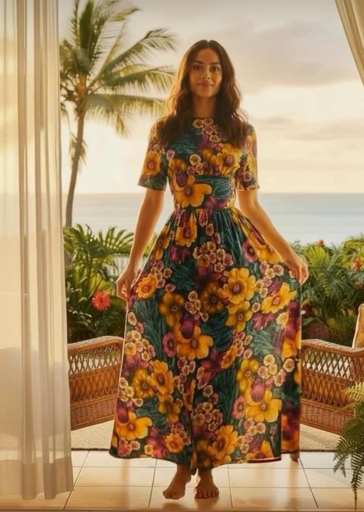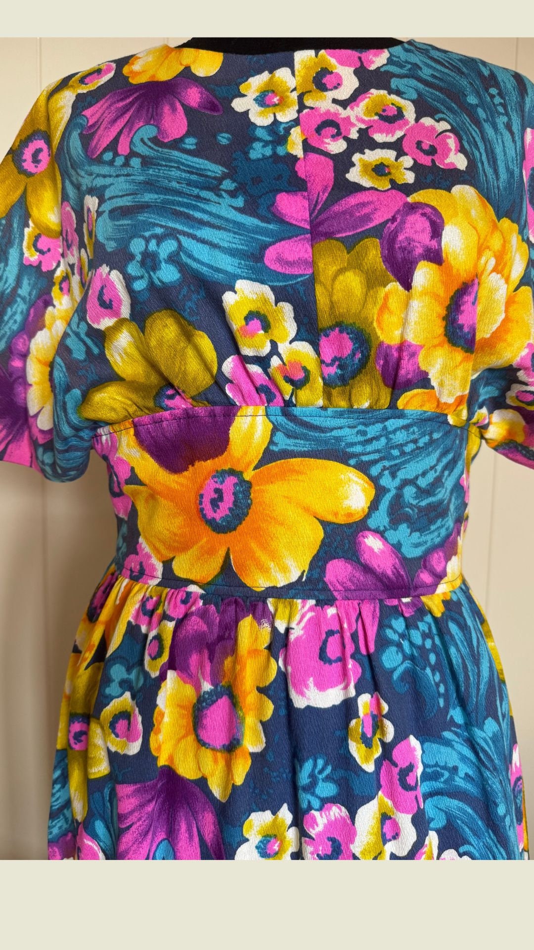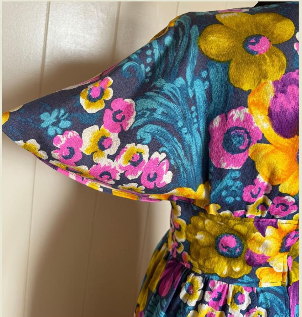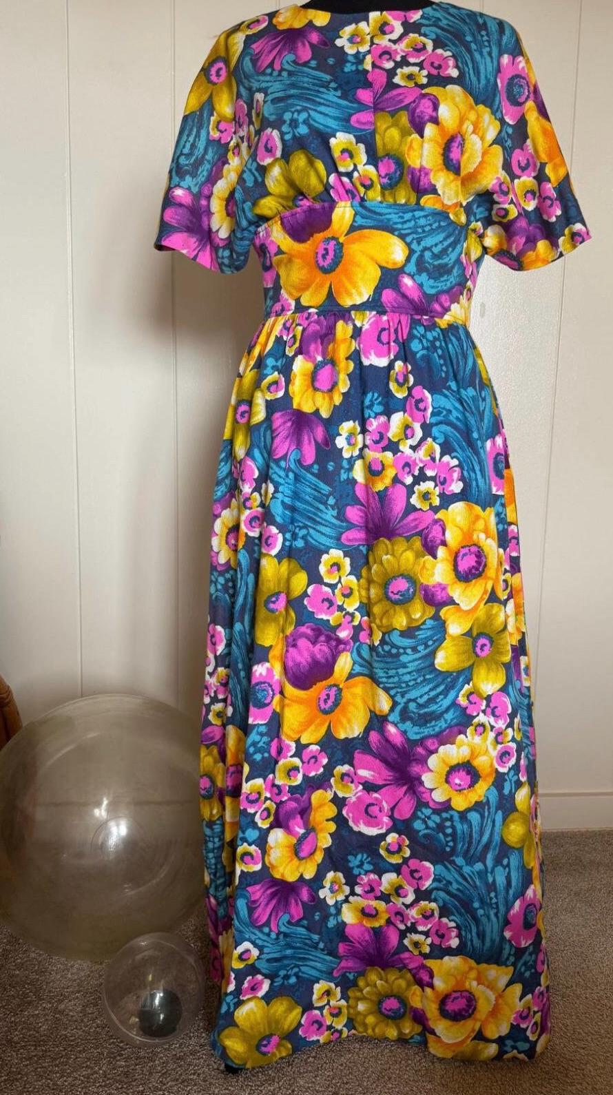 This 1970s floral dress, custom-made by a private seamstress, has all the elegance and charm of vintage fashion. The dress features a flattering vintage medium size fit, with a 30" waist and a 36" bust, ensuring a comfortable yet stylish silhouette. Measuring 56" in length, it gracefully flows. Perfect for any special occasion. The vibrant floral pattern on bark cloth reflects the era's love for bold and expressive prints's floral dress custom made ( private seamstress ) * pristine vintage condition