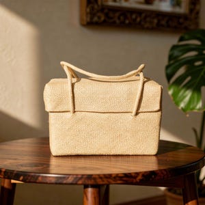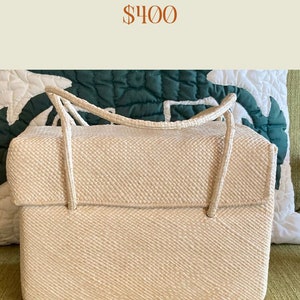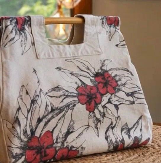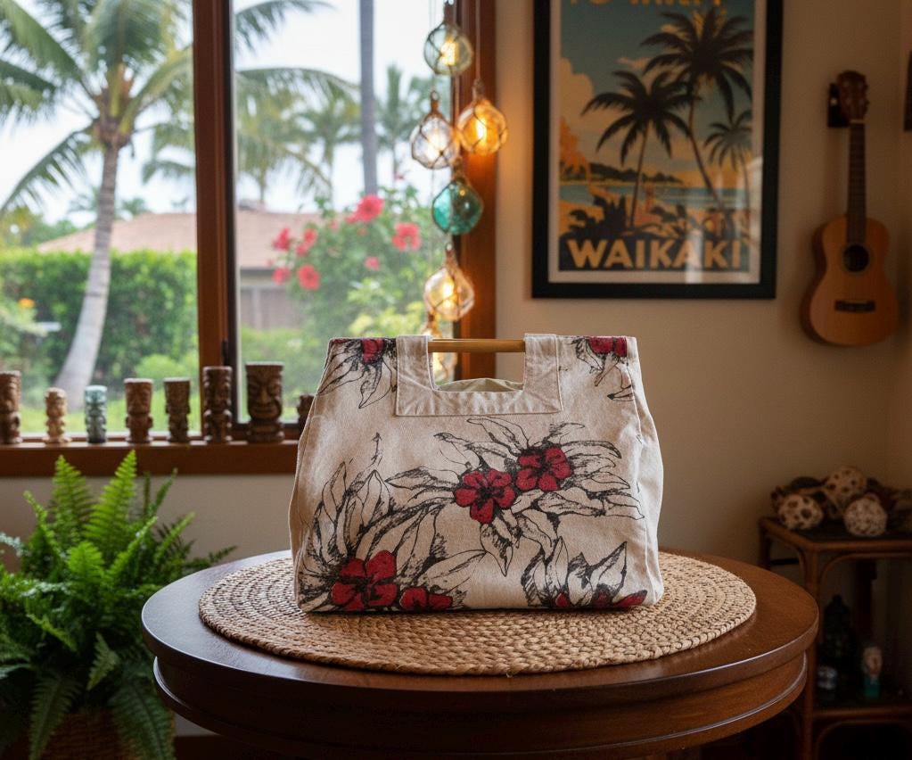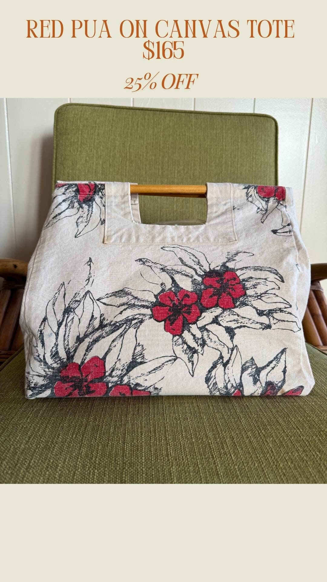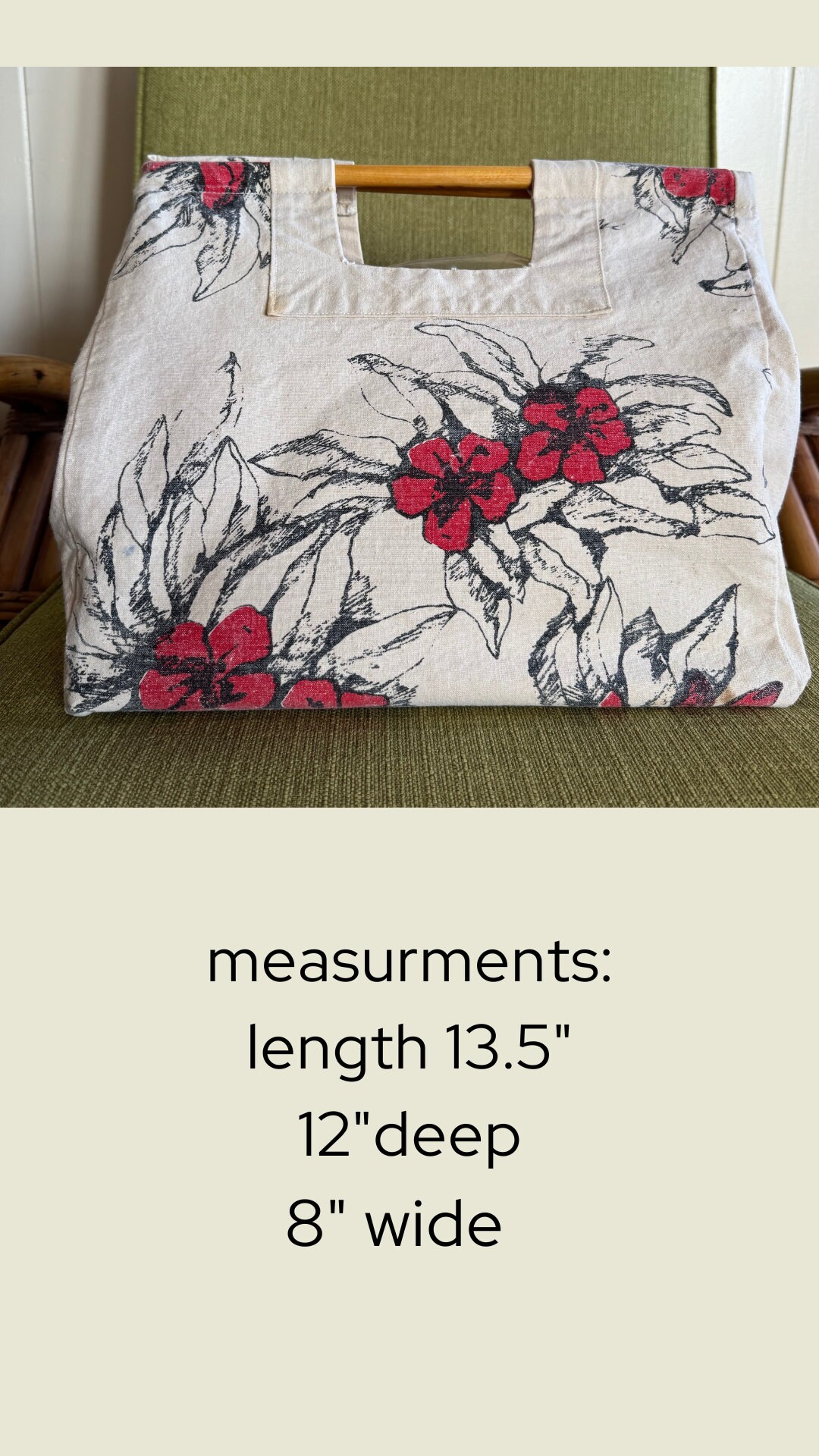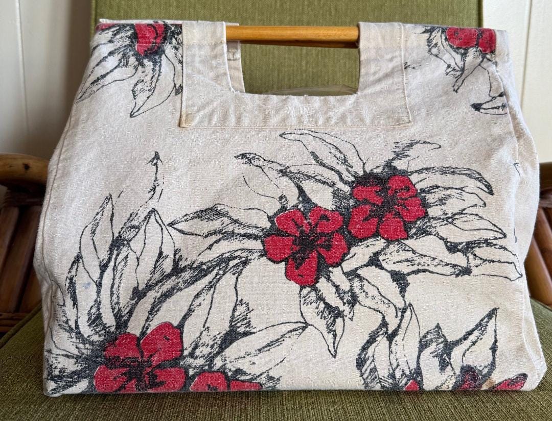 This 1980's vintage "red pua" Hawaii canvas tote is a fun and functional piece. Measuring 13.5 inches in length, 12 inches deep, and 8 inches wide, this tote offers ample space for everyday use. The red pua pattern captures the essence of Hawaii's natural beauty, making it a perfect accessory for both casual outings and special occasions. The addition of wood handles adds a touch of rustic charm. Whether you're heading to the beach, running errands, or attending a luau, this tote will add a touch of aloha spirit to any ensemble. *great condition for vintage / light wear