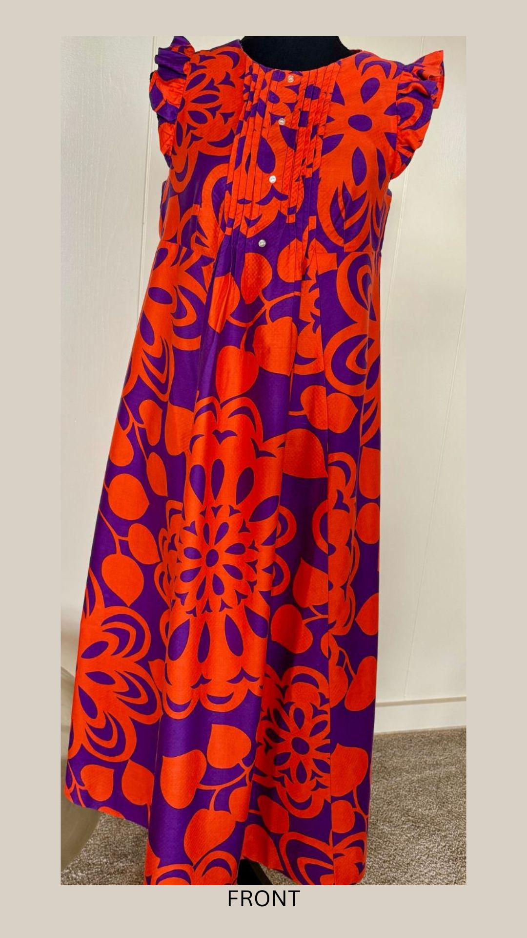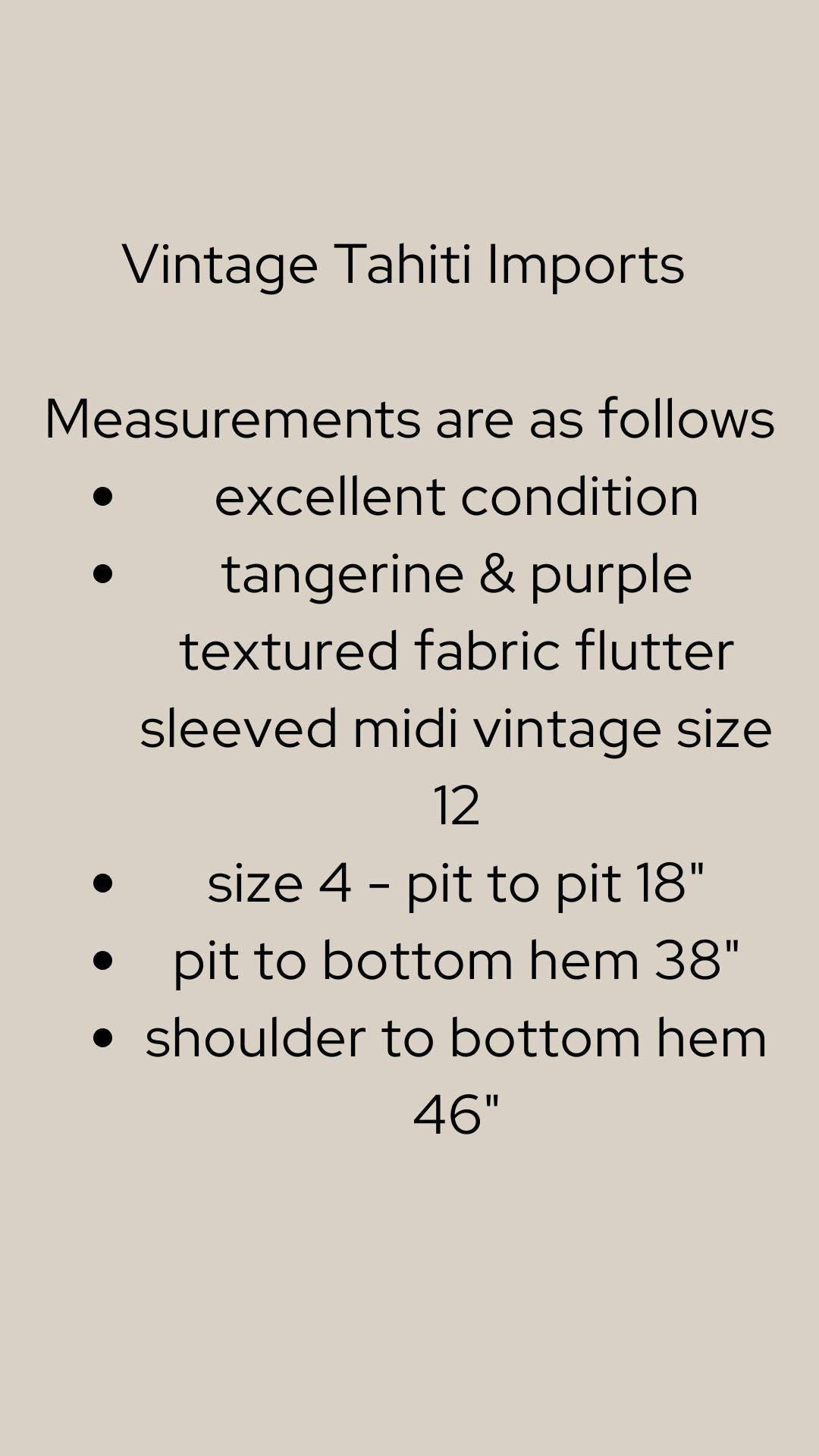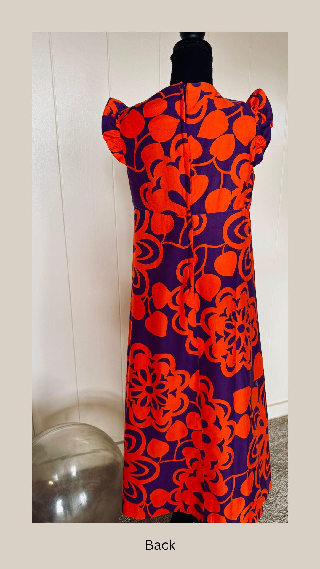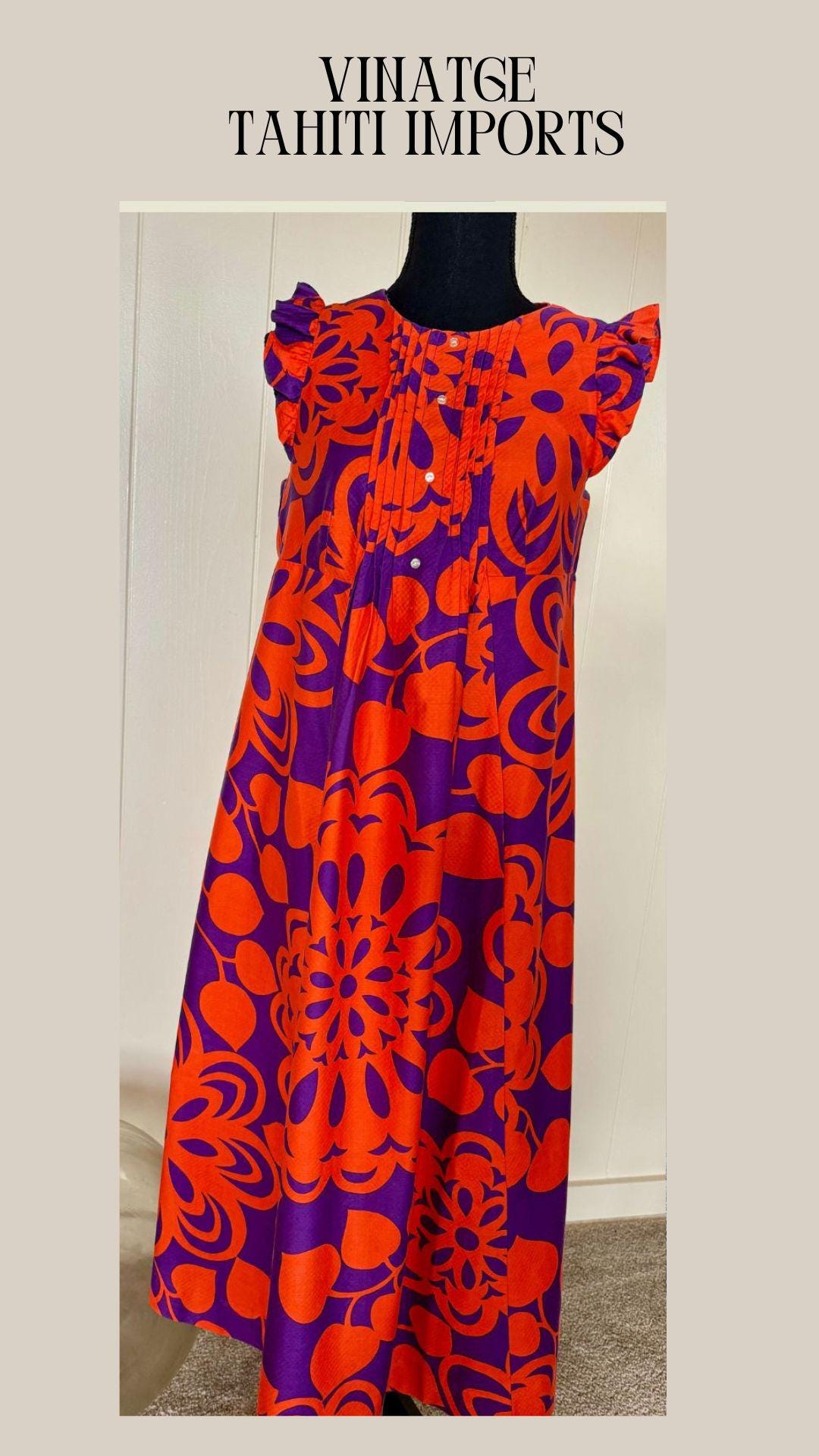 Discover a vibrant piece of fashion history with this exquisite heirloom dress, this came all the way from a collector in England. This Tahiti Imports dress is a unique tangerine and purple lightly textured fabric, this dress captures the essence of late 1960s to early 1970s style. The dress remains in excellent vintage condition, showcasing the quality and care it has received over the years. It is a vintage size 12, with measurements that include 18 inches from pit to pit, 38 inches from pit to bottom hem, and a total length of 46 inches from shoulder to bottom hem.