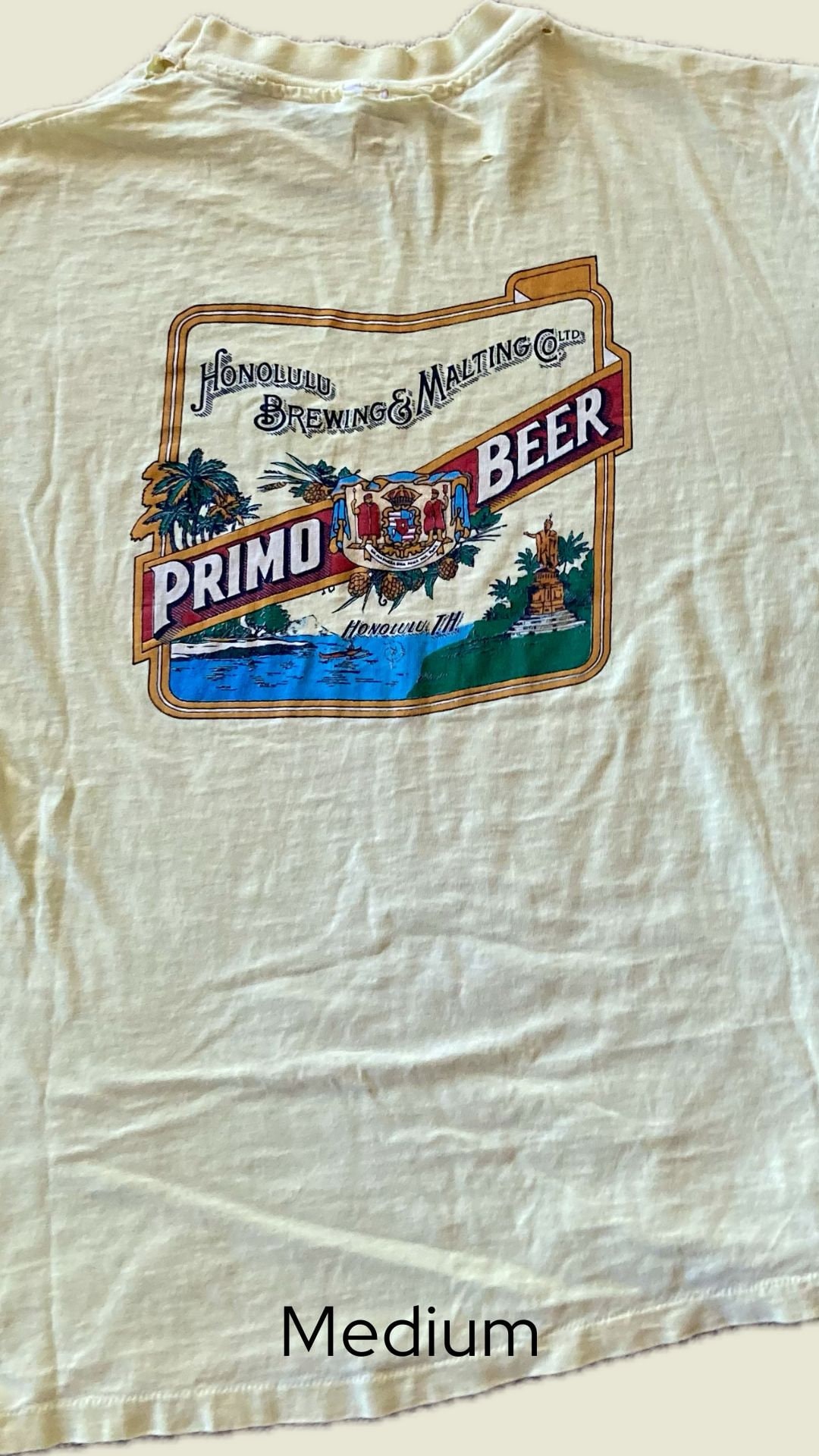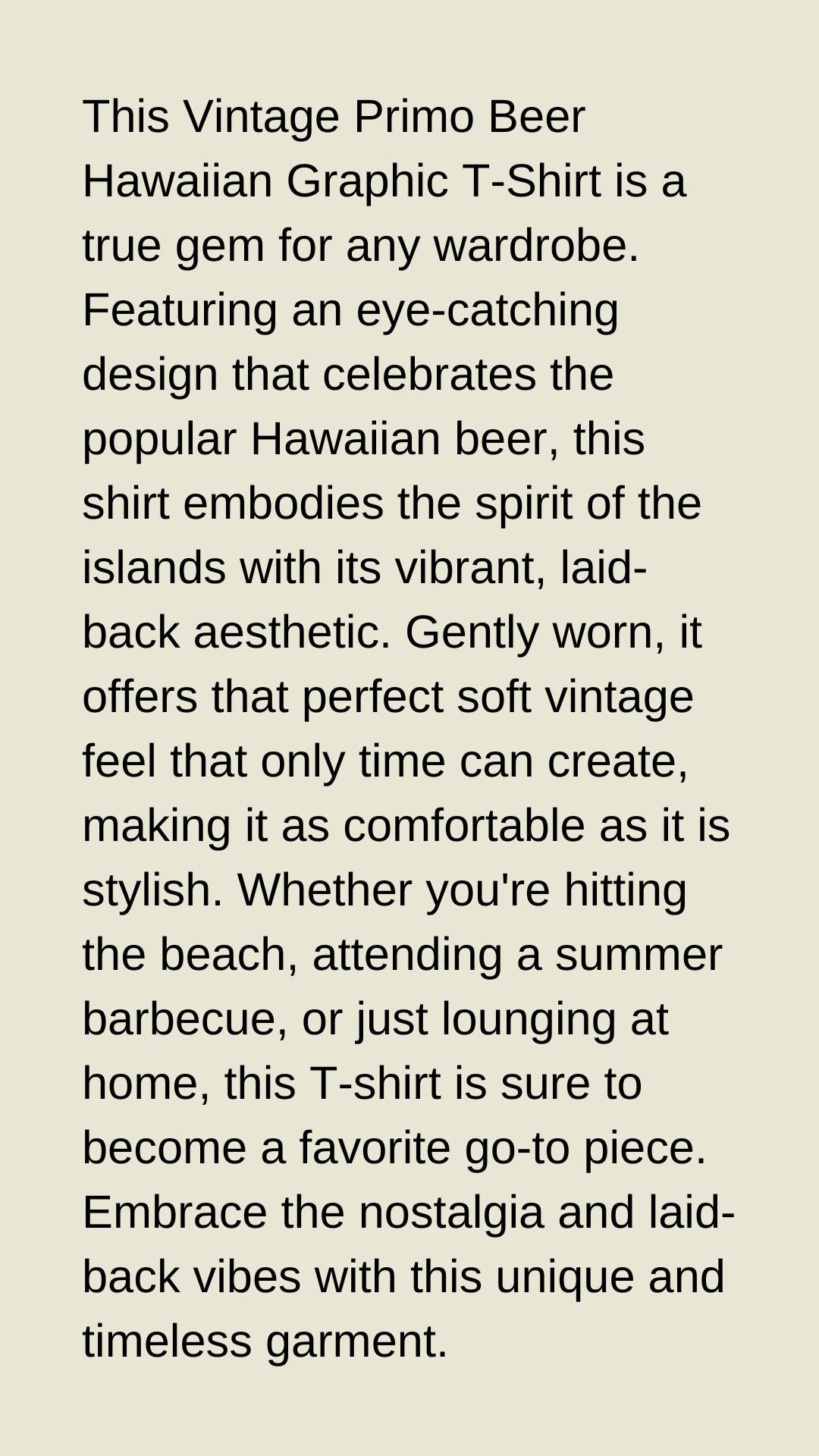 This Vintage Primo Beer Hawaiian Graphic T-Shirt is a true gem for any wardrobe. Featuring an eye-catching design that celebrates the popular Hawaiian beer, this shirt embodies the spirit of the islands with its vibrant, laid-back aesthetic. Gently worn, it offers that perfect soft vintage feel that only time can create, making it as comfortable as it is stylish. Whether you're hitting the beach, attending a summer barbecue, or just lounging at home, this T-shirt is sure to become a favorite go-to piece. Embrace the nostalgia and laid-back vibes with this unique and timeless garment.