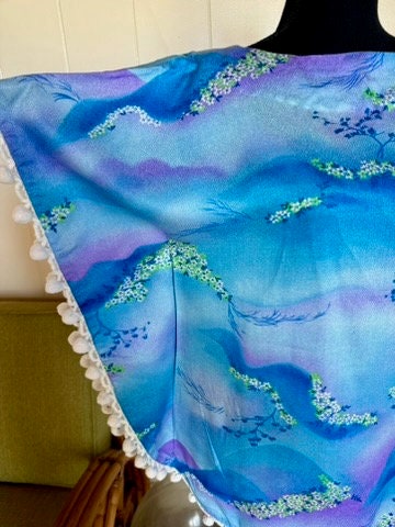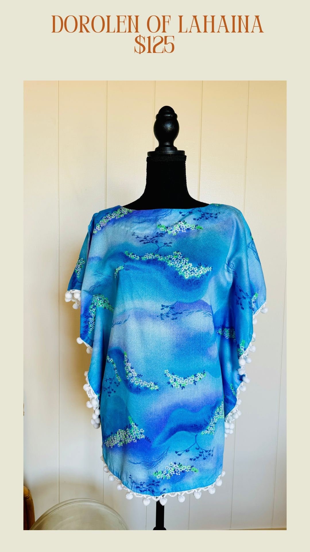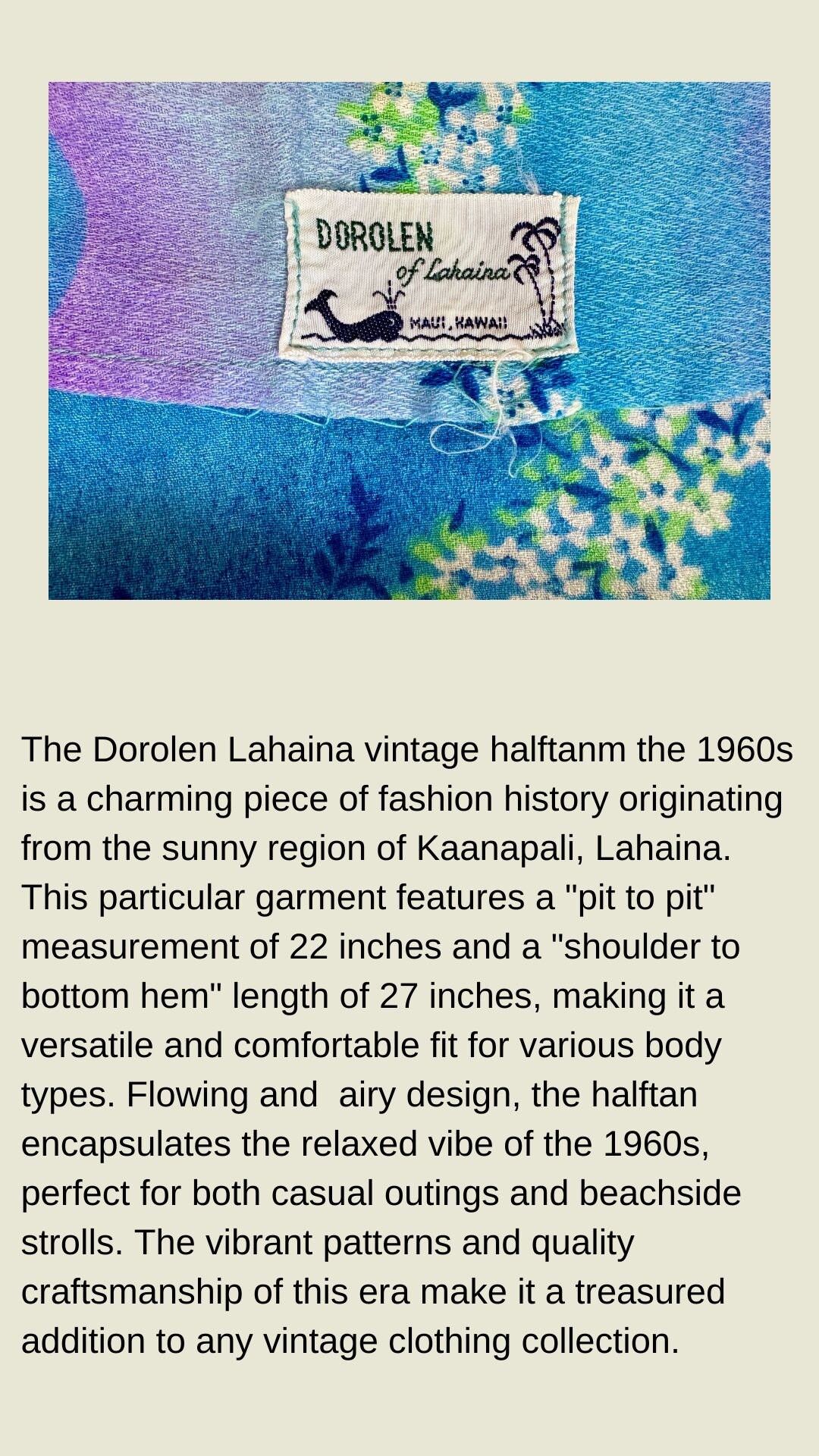 This 1960's Dorolen Lahaina vintage halftan is a charming piece of fashion history originating from the sunny region of Kaanapali, Lahaina. This particular garment features a "pit to pit" measurement of 22 inches and a "shoulder to bottom hem" length of 27 inches, making it a versatile and comfortable fit for various body types. Flowing and airy design, the halftan encapsulates the relaxed vibe of the 1960s, pair with jeans for both casual outings and beachside strolls or simply wear as beach cover up.