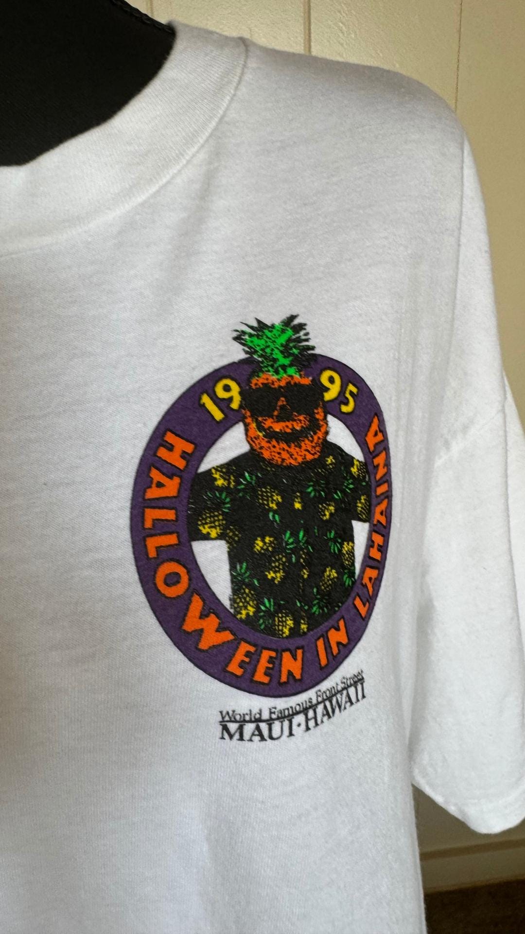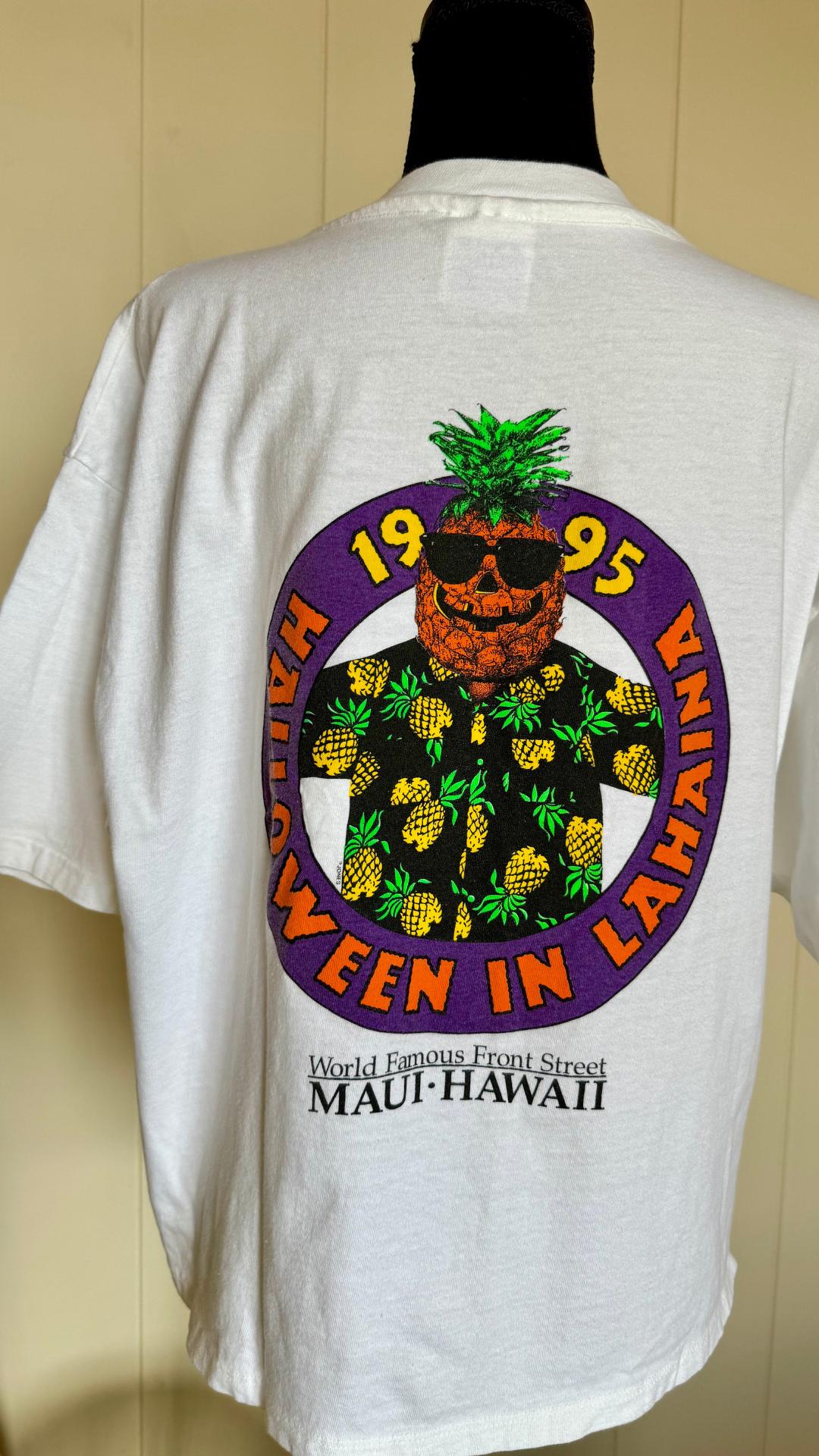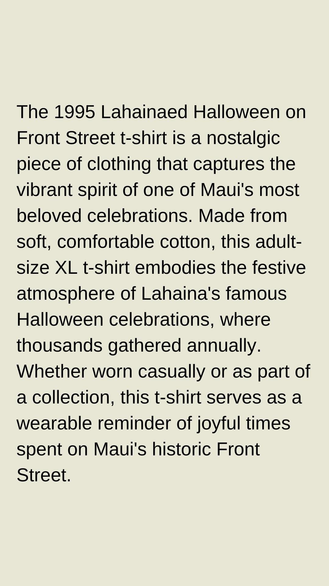 The 1995 Lahainaed Halloween on Front Street t-shirt is a nostalgic piece of clothing that captures the vibrant spirit of one of Maui's most beloved celebrations. Made from soft, comfortable cotton, this adult-size XL t-shirt embodies the festive atmosphere of Lahaina's famous Halloween celebrations, where thousands gathered annually. Whether worn casually or as part of a collection, this t-shirt serves as a wearable reminder of joyful times spent on Maui's historic Front Street.