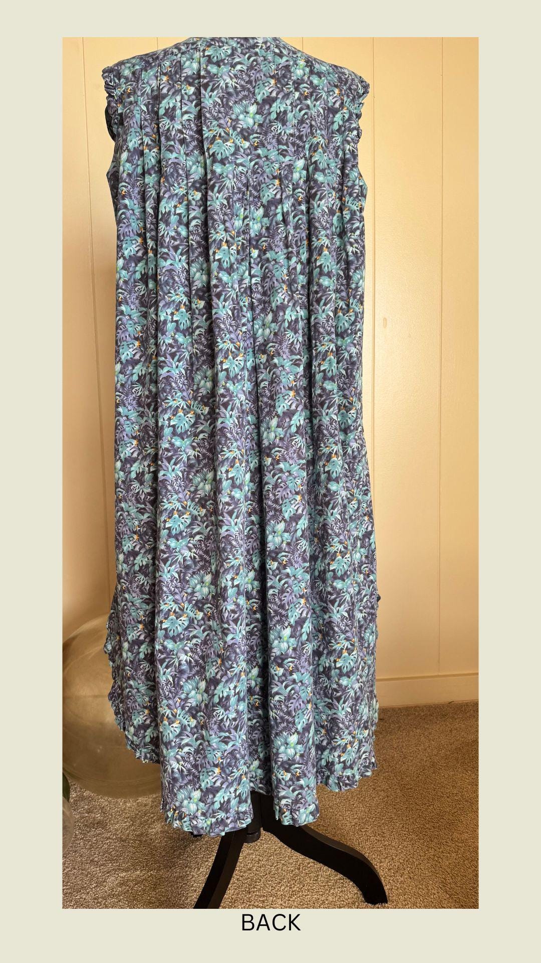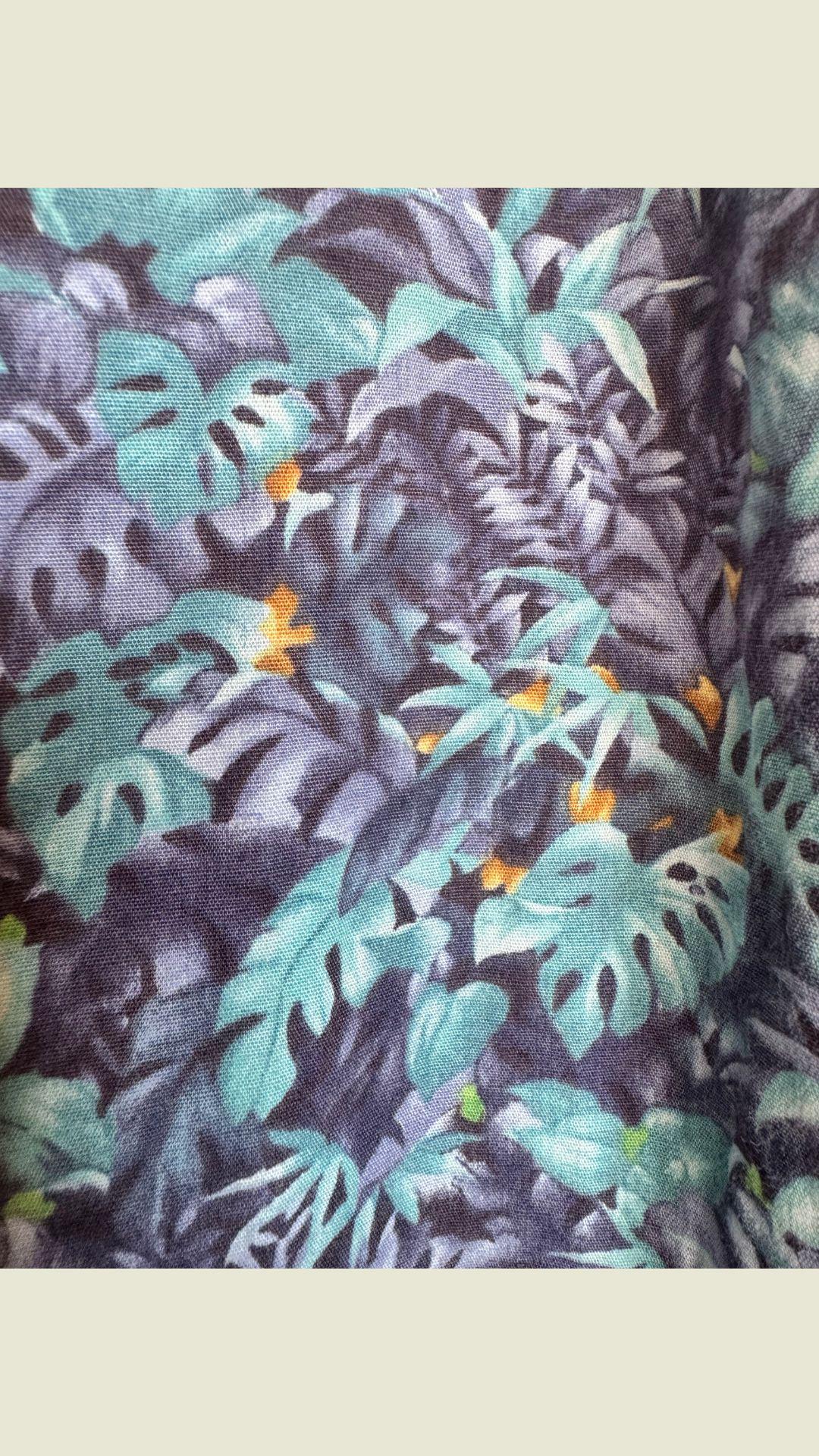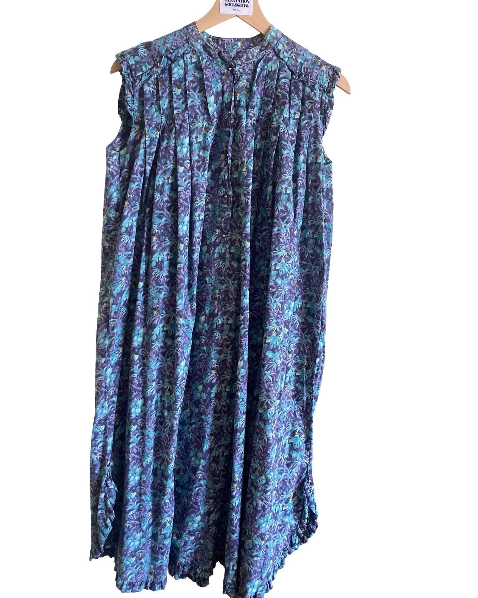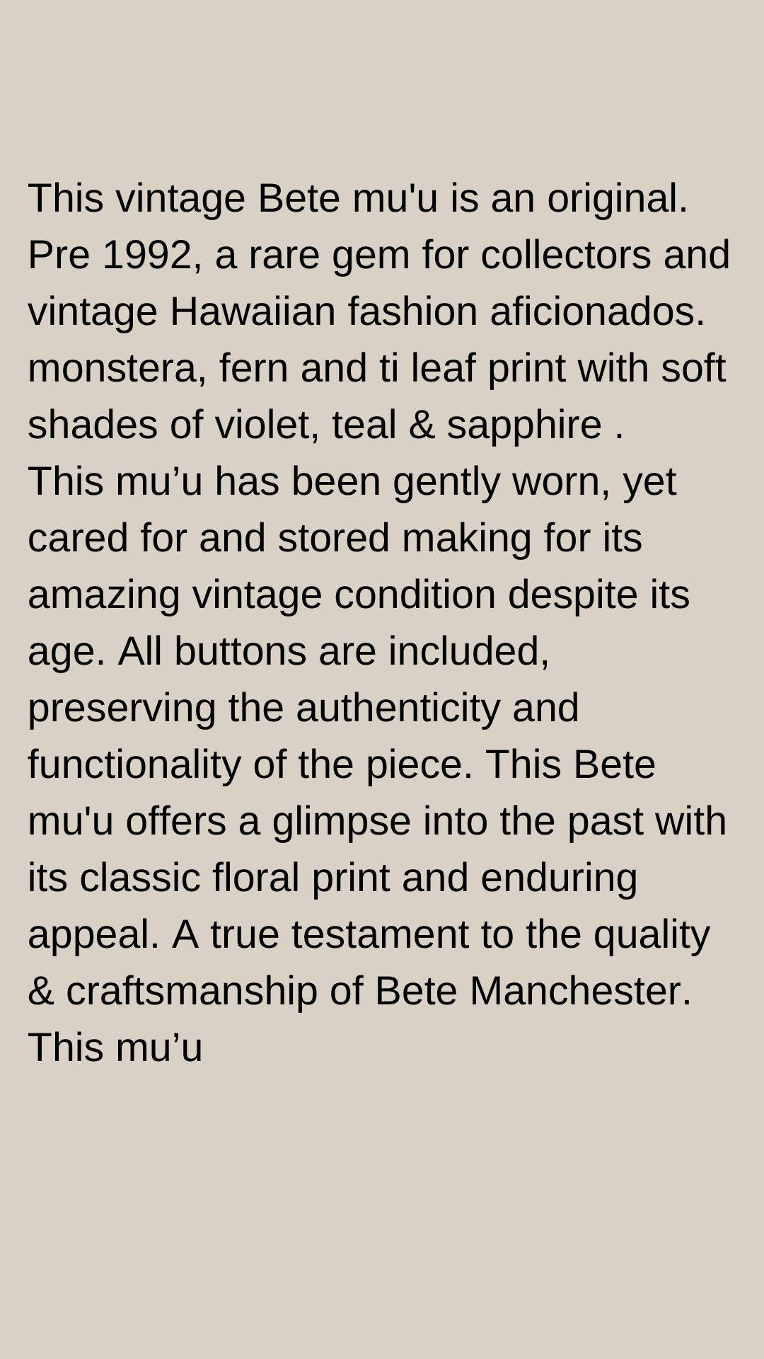 This vintage Bete mu'u is an original. Pre 1992, a rare gem for collectors and vintage Hawaiian fashion aficionados. monstera, fern and ti leaf print with soft shades of violet, teal & sapphire . This mu'u has been gently worn, yet cared for and stored making for its amazing vintage condition despite its age. Making for its pristine vintage condition. All buttons are included, preserving the authenticity and functionality of the piece. This Bete mu'u offers a glimpse into the past with its classic floral print and enduring appeal. A true testament to the quality & craftsmanship of Bete Manchester. This mu'u measures: pit to pit 22" shoulder to bottom hem 41" * considered midi length