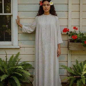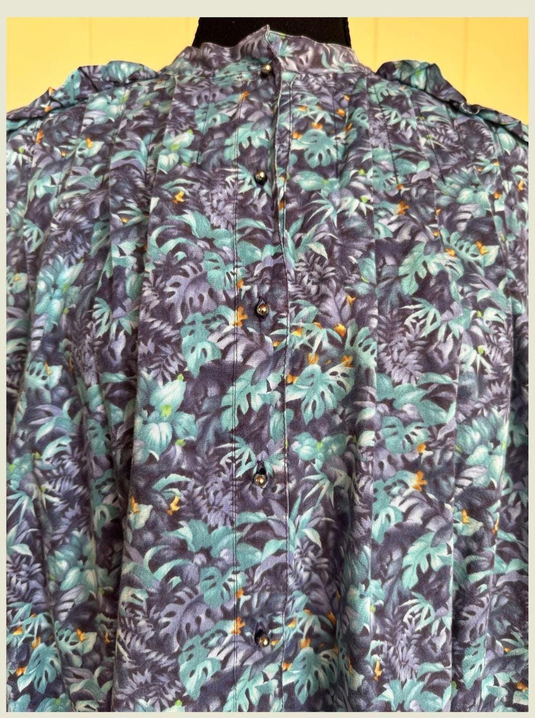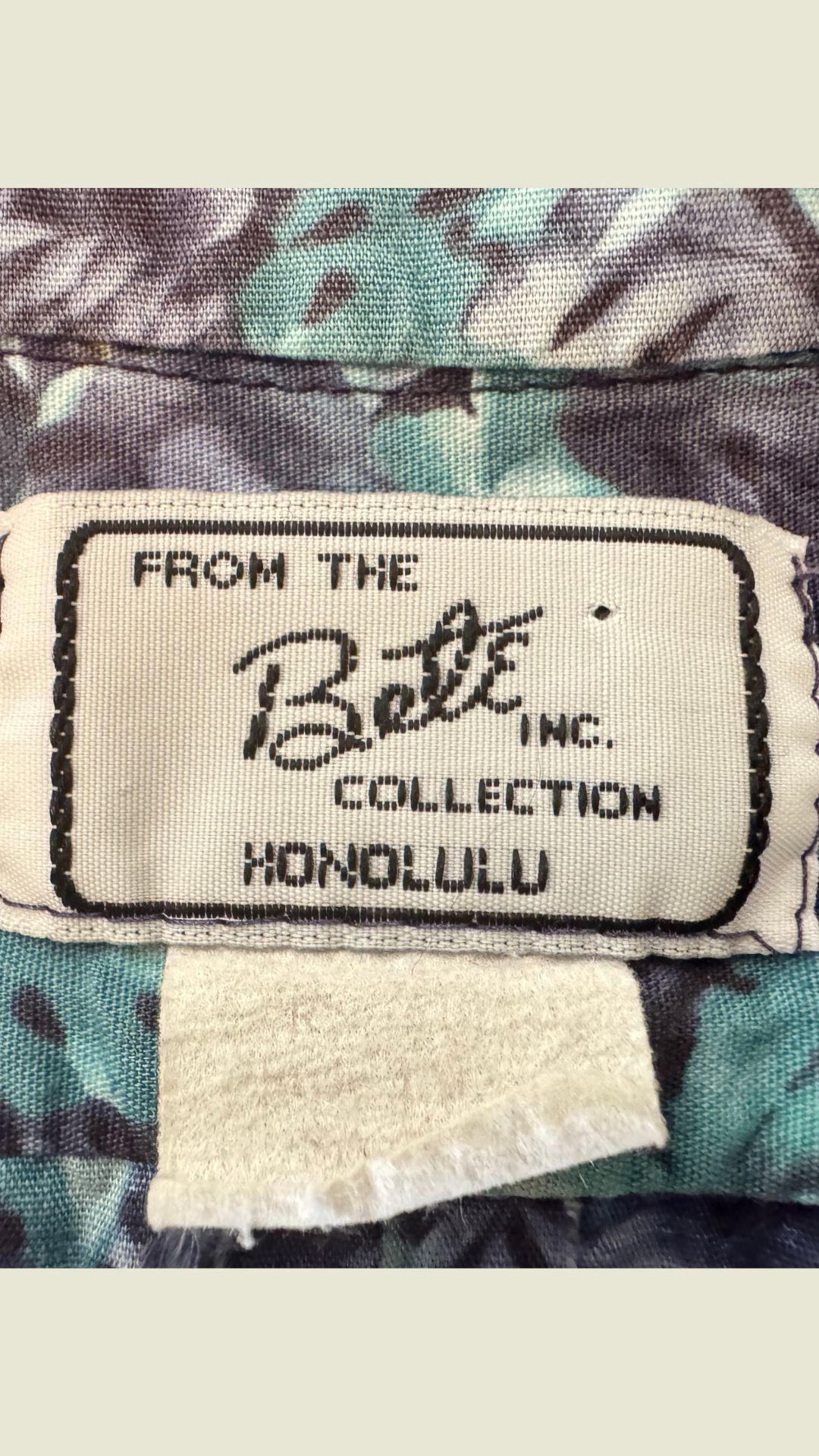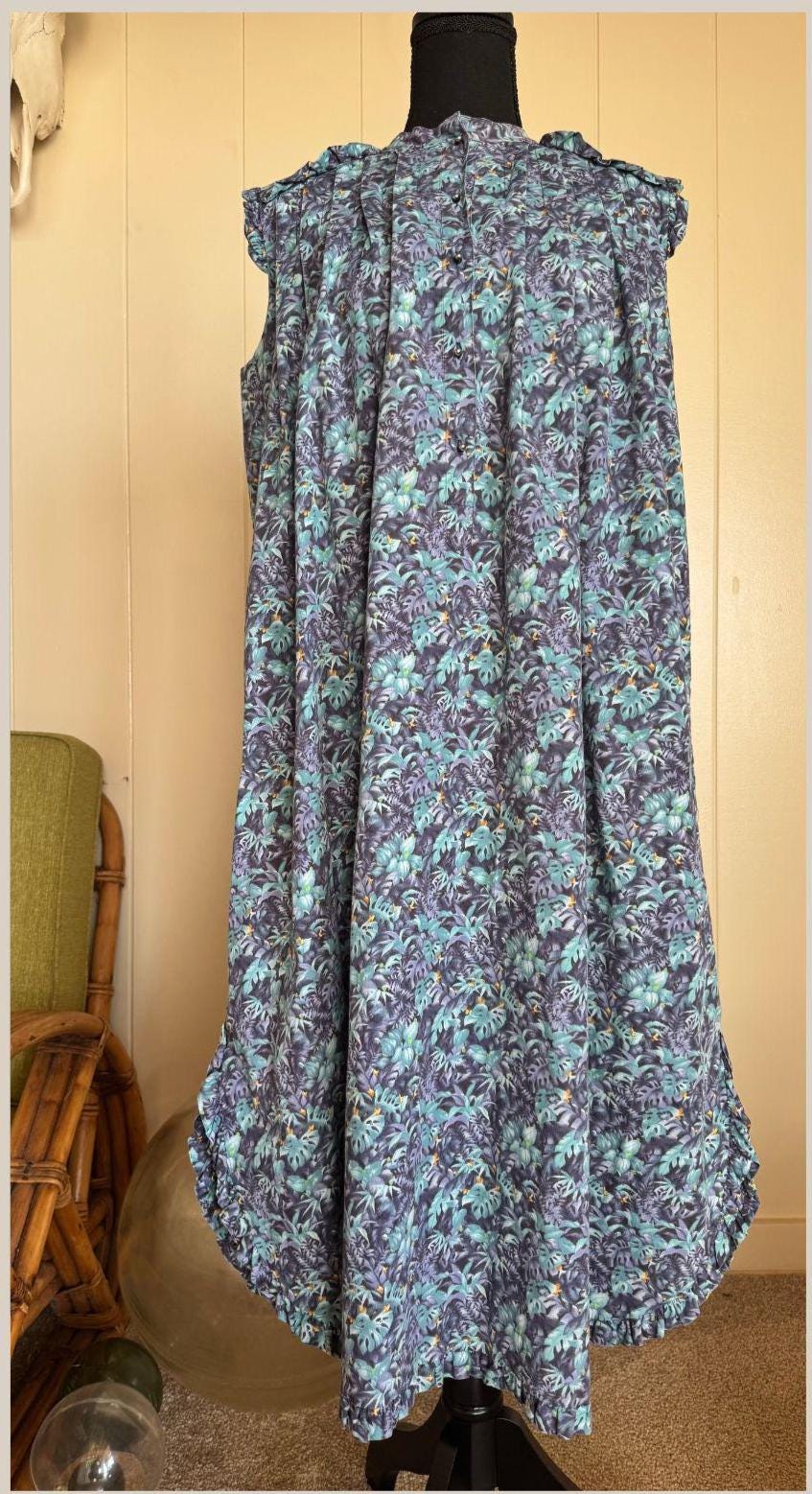 This vintage Bete mu'u is an original. Pre 1992, a rare gem for collectors and vintage Hawaiian fashion aficionados. monstera, fern and ti leaf print with soft shades of violet, teal & sapphire . This mu'u has been gently worn, yet cared for and stored making for its amazing vintage condition despite its age. Making for its pristine vintage condition. All buttons are included, preserving the authenticity and functionality of the piece. This Bete mu'u offers a glimpse into the past with its classic floral print and enduring appeal. A true testament to the quality & craftsmanship of Bete Manchester. This mu'u measures: pit to pit 22" shoulder to bottom hem 41" * considered midi length