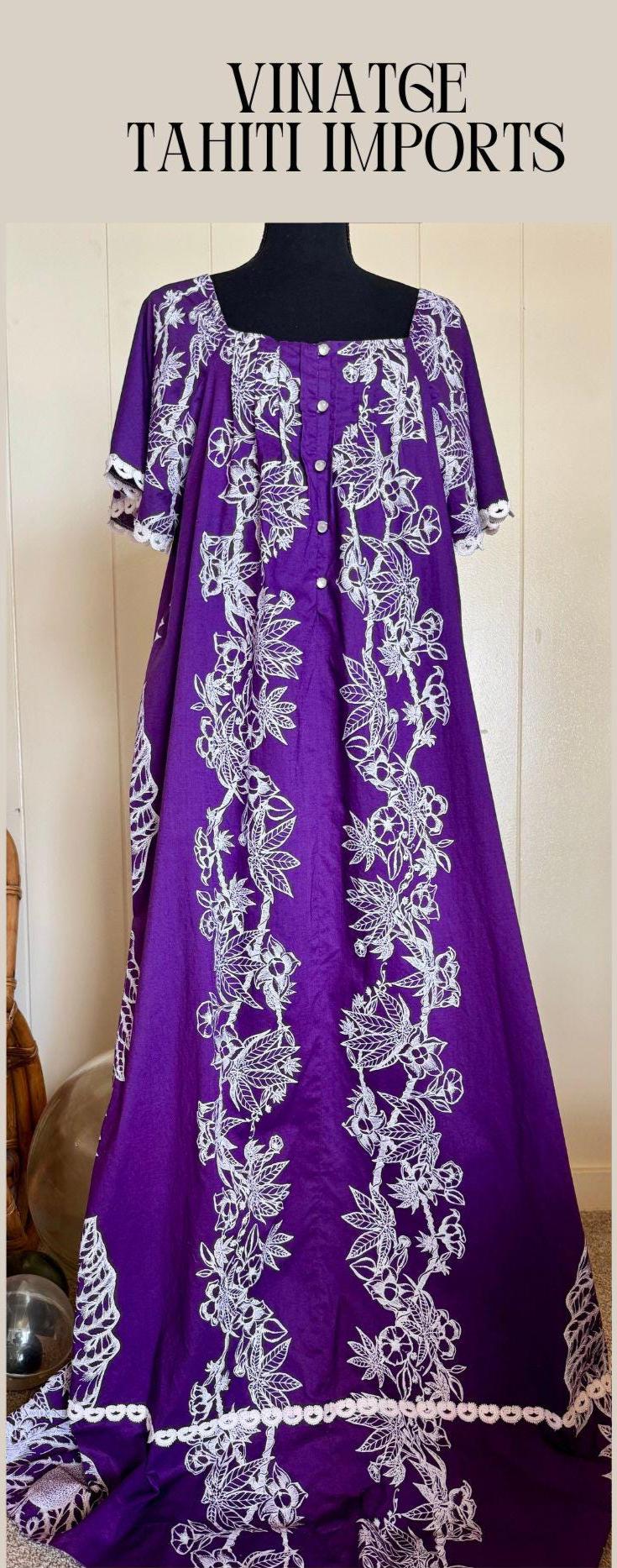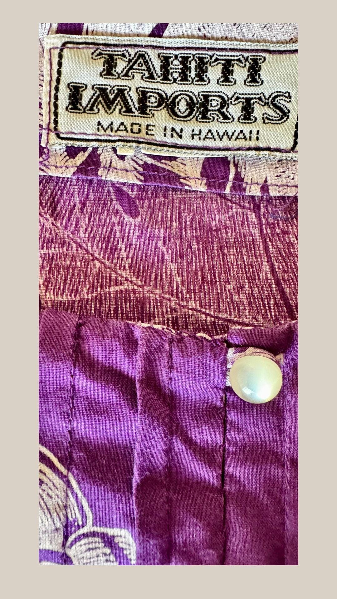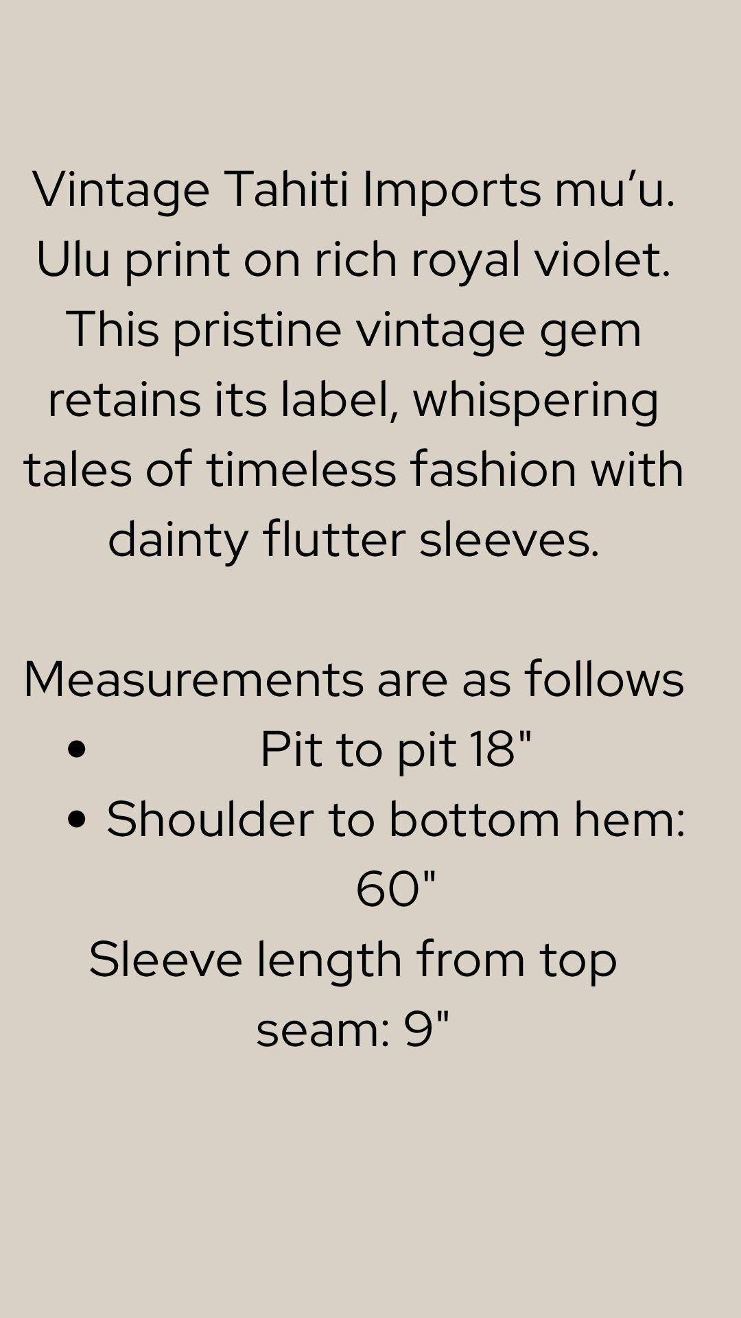 Vintage Tahiti Imports muu. Ulu print on rich royal violet. This pristine vintage gem retains its label, whispering tales of timeless fashion with dainty flutter sleeves. Measurements are as follows • Pit to pit 18" • Shoulder to bottom hem: 60" Sleeve length from top seam: 9"