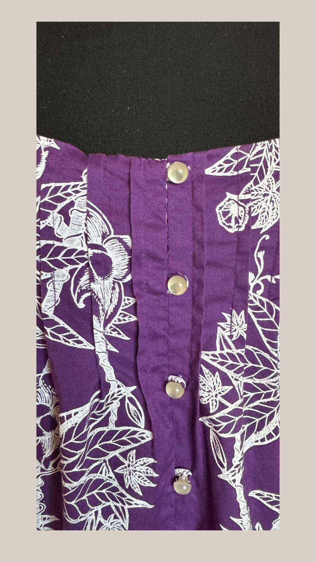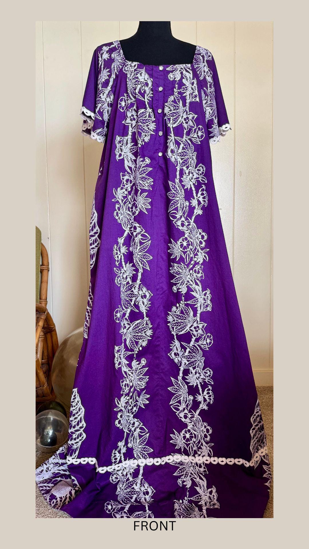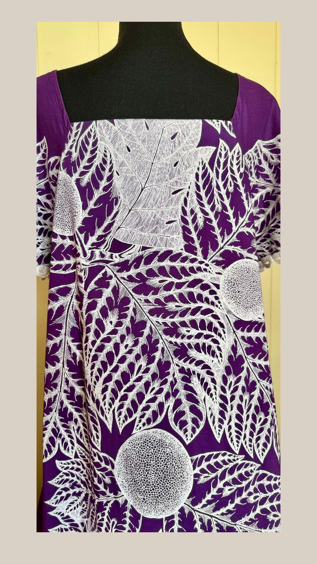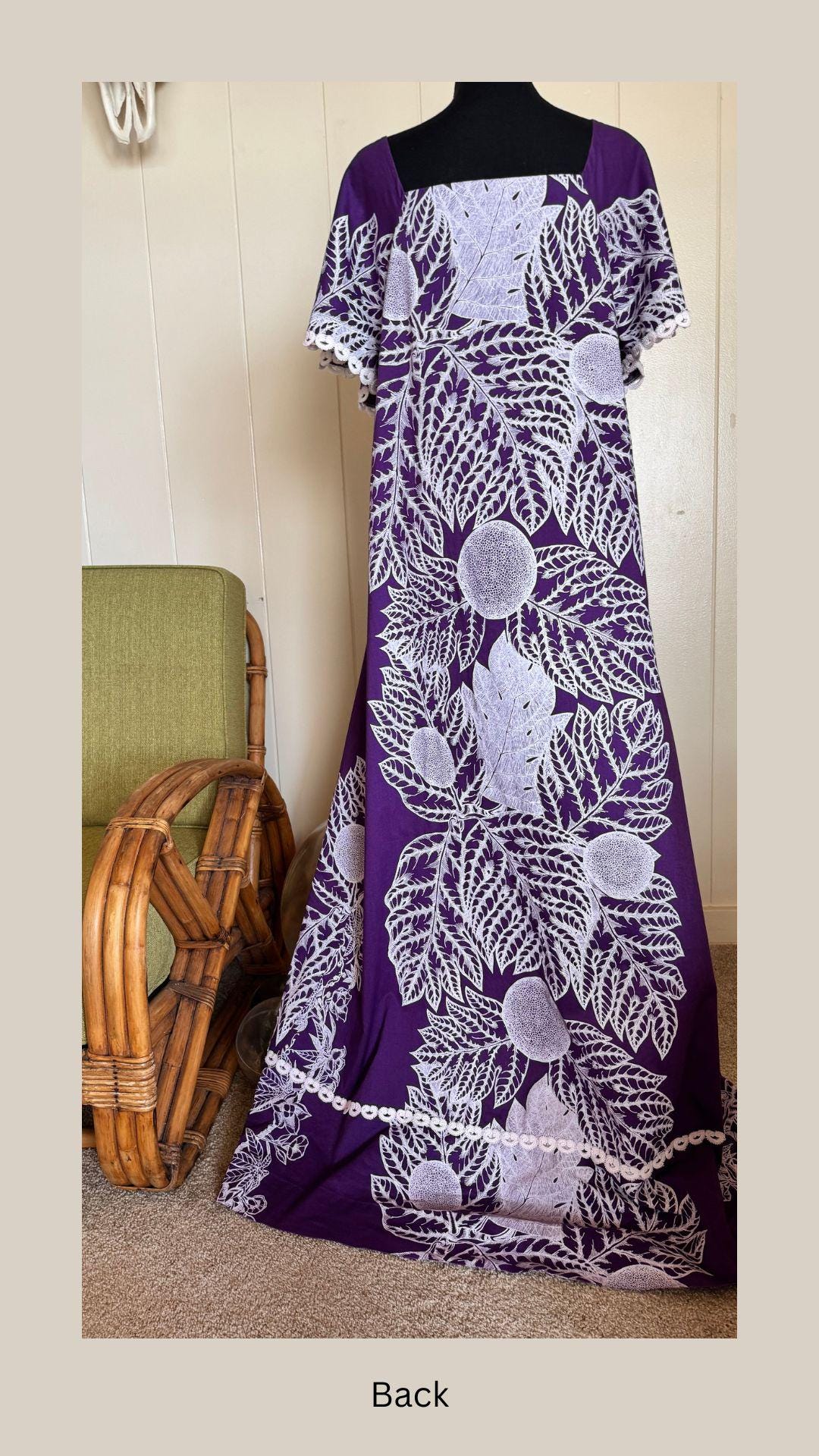 Vintage Tahiti Imports muu. Ulu print on rich royal violet. This pristine vintage gem retains its label, whispering tales of timeless fashion with dainty flutter sleeves. Measurements are as follows • Pit to pit 18" • Shoulder to bottom hem: 60" Sleeve length from top seam: 9"